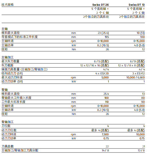 Swiss DT 系列瑞士型車床專業(yè)設(shè)計滿足典型長 短車削工件的各種要求。該系列機床簡單易 用,加工直徑達 13 和 25.4 mm,可顯著提高生 產(chǎn)效率。Swiss DT 系列采用先進的技術(shù)和高效的五軸運動結(jié)構(gòu),是所有車削和銑削加工的理想之選。